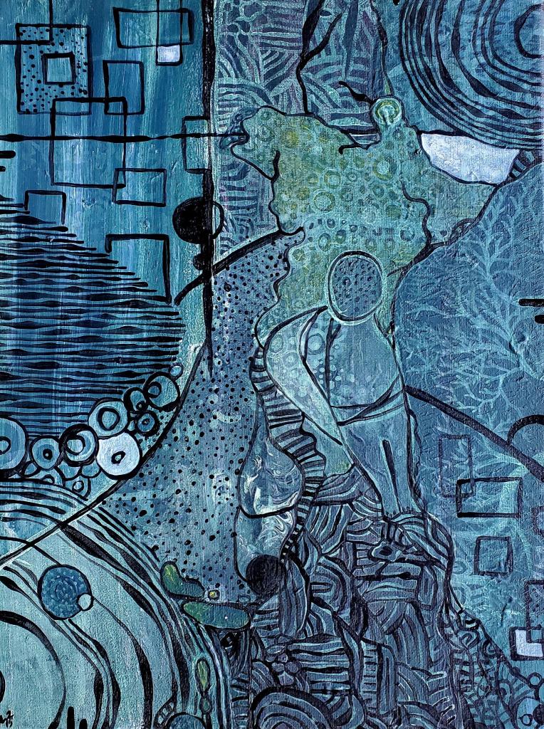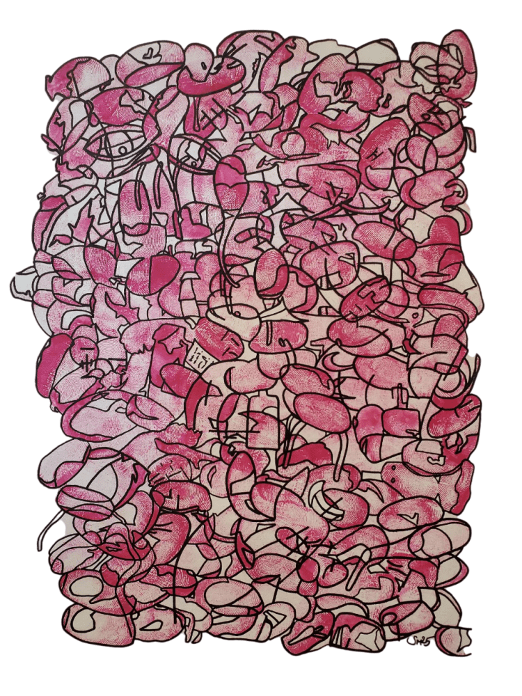 Abstrakt Im Wuchs – 2025 – Acryl auf Leinwand – 30 x 40cm Bewegnung – 2022 – Acryl auf Papier – 29,7 x 42cm Abdrücke – 2025 – Wasserfarbe, Filzstift auf Papier – 14,8 x 21cm Knogel – 2014 – Kugelschreiber auf Papier (digitale Nachbearbeitung) – 14,8 x 21cm